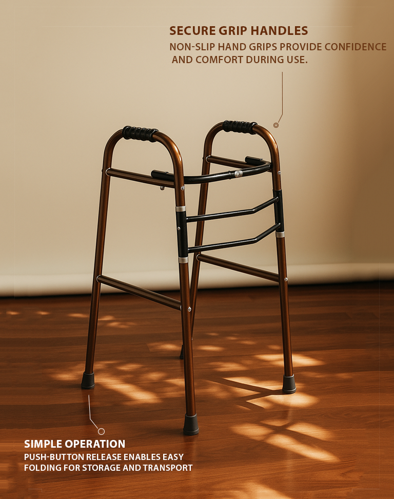 Designed for safety and convenience, our walkers feature push-button mechanisms that may be operated by fingers, palms, or even the side of the hand